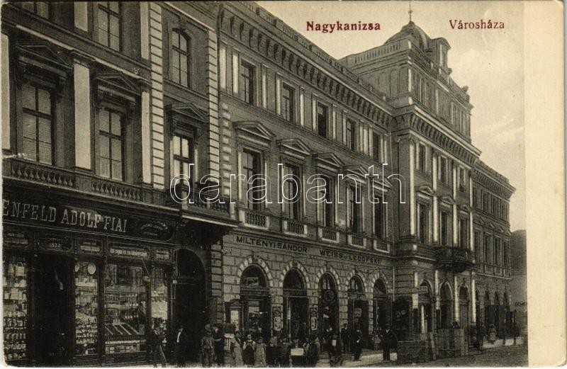 Leírás: 1912 Nagykanizsa, Városháza, Miltényi Sándor, Weiss és Ledofski, Rosenfeld Adolf fiai üzlete. Schwarz és Tauber kiadása (EK)