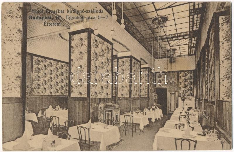 1918 Budapest V. Erzsébet királyné szálloda és étterem, belső. Egyetem... https://www.darabanth.com/hu/415-Gyorsarveres/415.0/Kepeslapok/Magyarorszag~1000005/1918-Budapest-V-Erzsebet-kiralyne-szalloda-es-etterem-belso-Egyetem-utca-5-7-plus-1918-MAGY~II2608655