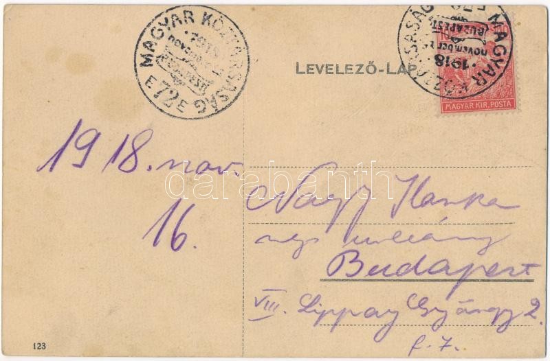 Leírás: 1918 Budapest V. Erzsébet királyné szálloda és étterem, belső. Egyetem utca 5-7. + "1918 MAGYAR KÖZTÁRSASÁG E 72 E" So. Stpl (ázott / wet damage)