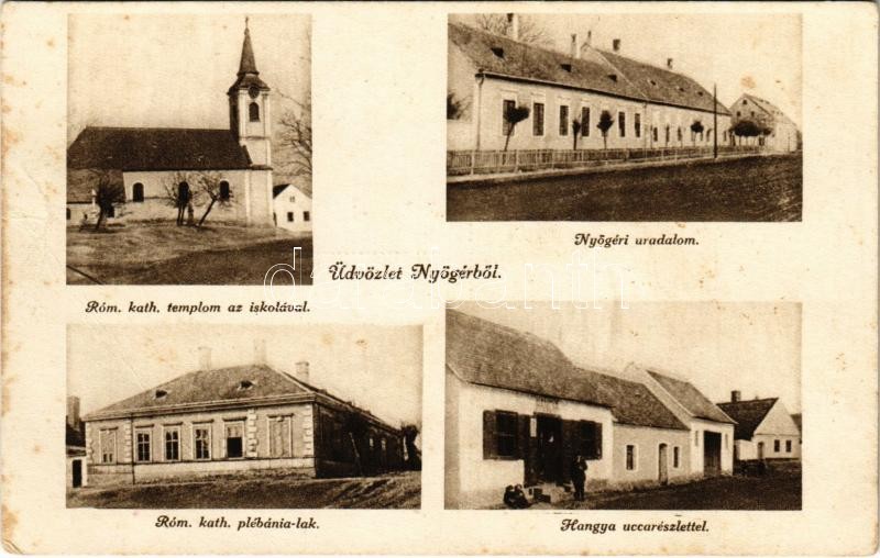 1929 Nyőgér, Római katolikus templom az iskolával, Nyőgéri uradalom, Római katolikus plébánia lak, Hangya szövetkezet üzlete. Steegmüller fényirda (EB)