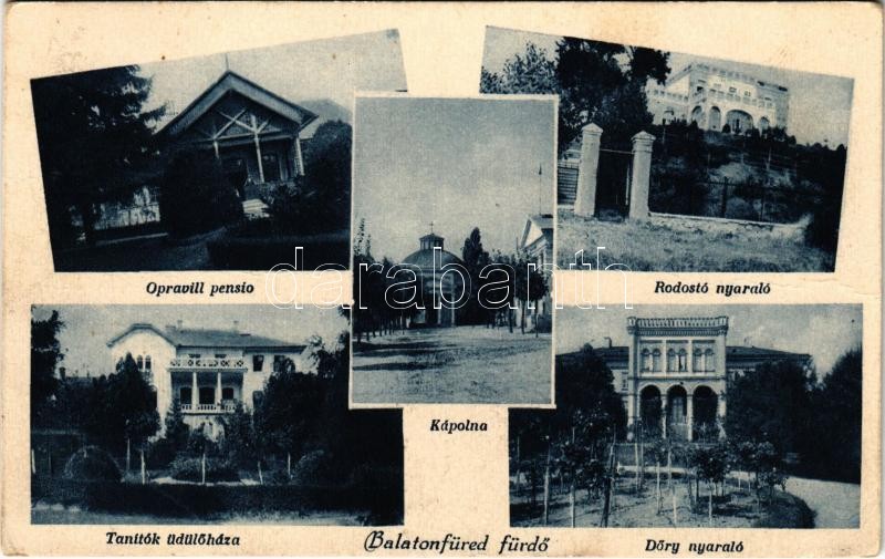 Leírás: 1930 Balatonfüred, Opravill pensio, Rodostó nyaraló, Kápolna, Tanítók üdülőháza, Dőry nyaraló, villa (EK)