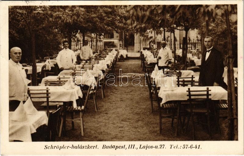 1936 Budapest II. Schräpler-halászkert (később Sipos vendéglő), kerthe... https://www.darabanth.com/hu/415-Gyorsarveres/415.0/Kepeslapok/Magyarorszag~1000005/1936-Budapest-II-Schrapler-halaszkert-kesobb-Sipos-vendeglo-kerthelyiseg-pincerekkel-La~II2602574