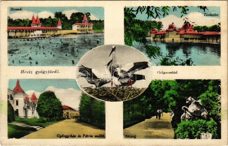 Leírás: 1941 Hévíz, Strand, Tó részlet, Gólya család, György-ház és Pátria szálló, sétány