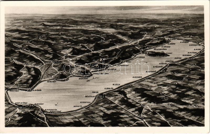 Balaton, Madártávlatból, szárazföldi úthálózat https://www.darabanth.com/hu/415-Gyorsarveres/415.0/Kepeslapok/Magyarorszag~1000005/Balaton-Madartavlatbol-szarazfoldi-uthalozat~II2512187