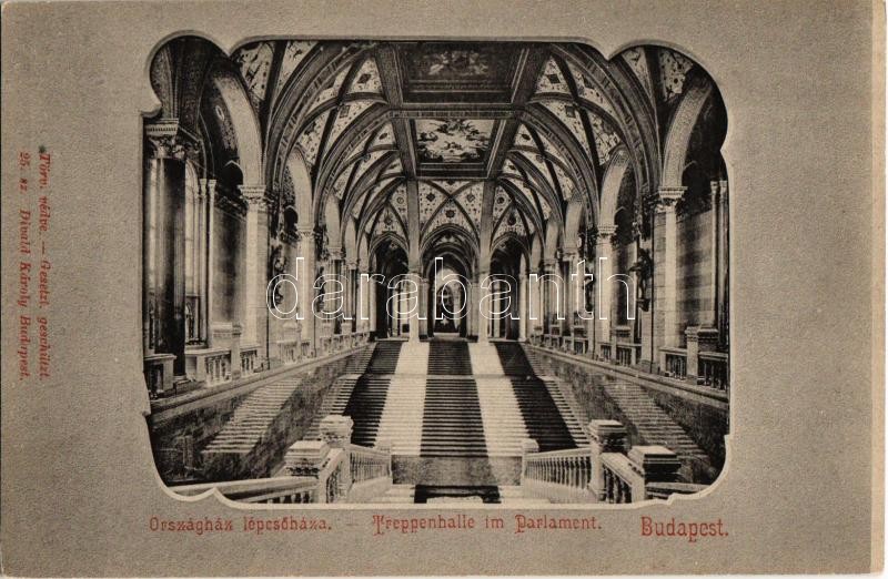 Budapest V. Országház lépcsőháza, belső. Divald Károly kiadása https://www.darabanth.com/hu/415-Gyorsarveres/415.0/Kepeslapok/Magyarorszag~1000005/Budapest-V-Orszaghaz-lepcsohaza-belso-Divald-Karoly-kiadasa~II1952803