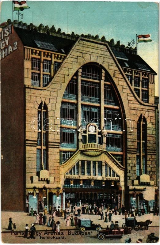 Budapest V. Párisi Nagyáruház utcai homlokzata, reklámlap https://www.darabanth.com/hu/415-Gyorsarveres/415.0/Kepeslapok/Magyarorszag~1000005/Budapest-V-Parisi-Nagyaruhaz-utcai-homlokzata-reklamlap~II1970588