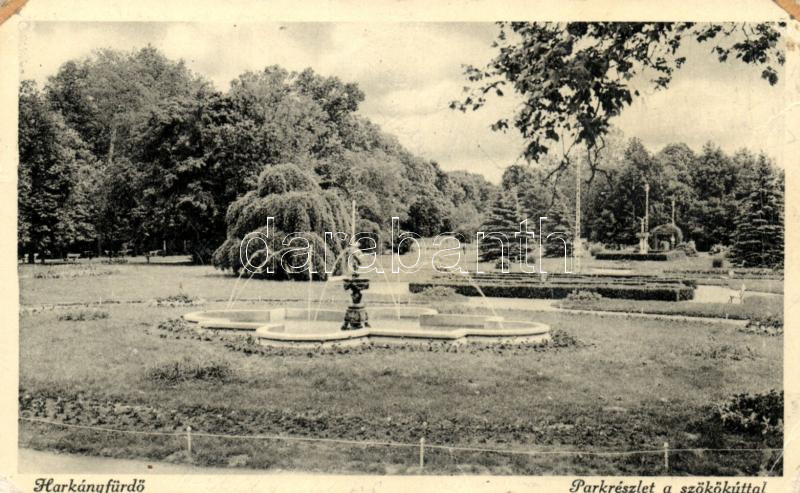 Leírás: Harkányfürdő, parkrészlet szökőkúttal, kiadja Szilczer Gyula (ragasztónyom / gluemark)
