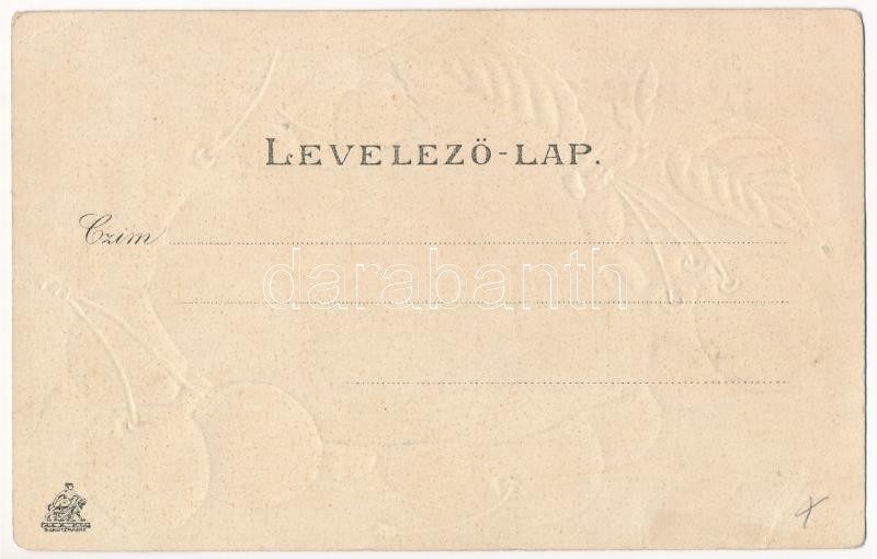 Leírás: Mohács, Duna-part, hajóállomás, gőzhajó, hajómalom. Weiser Miksa kiadása. Szecessziós meggyes dombornyomott litho keret / floating ship mill (boat mill). Art Nouveau, Emb. litho frame with cherry (apró lyuk / tiny pinhole)