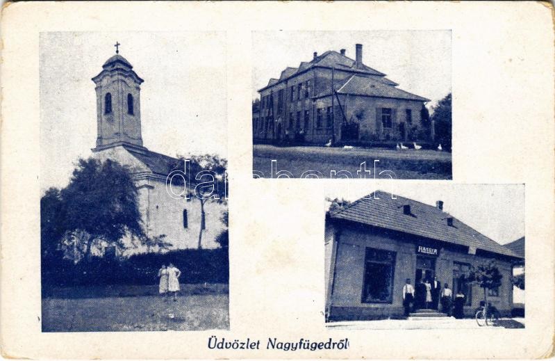 Leírás: Nagyfüged, templom, Hangya szövetkezet üzlete és saját kiadása (EK)