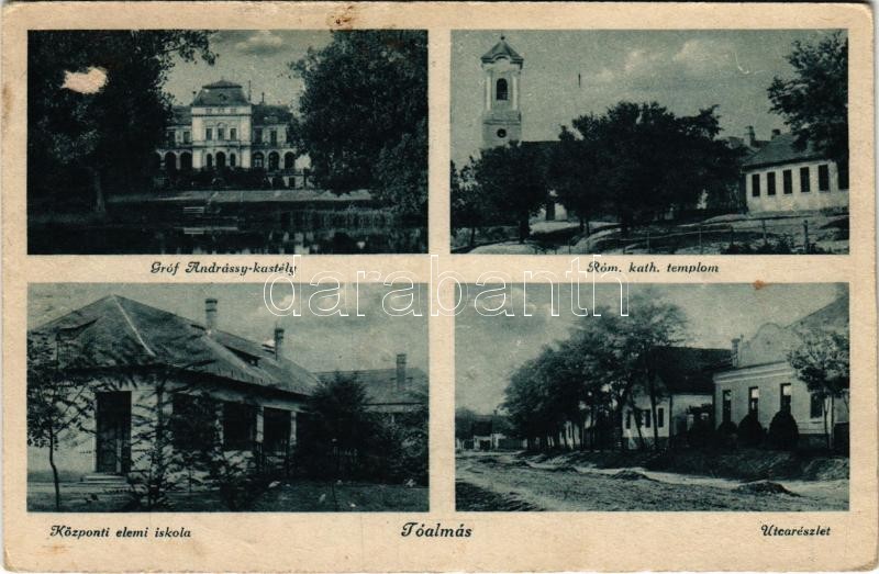 Leírás: Tóalmás, Gróf Andrássy kastély, Római katolikus templom, Központi elemi iskola, utca részlet (fl)