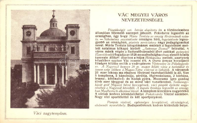 Leírás: Vác megyei város nevezetességei, Váci nagytemplom, kiadja Farkasfalvi Kornél