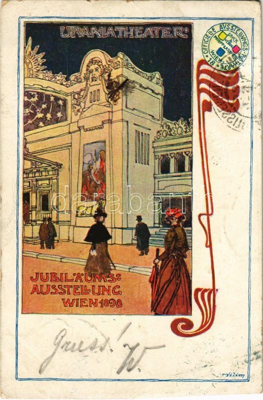 Leírás: 1898 (Vorläufer) Wien, Vienna, Bécs; Jubiläumsausstellung, Urania Theater. Officielle Ausstellungs-Postkarte Philipp & Kramer 18. / Viennese Jubilee Exhibition advertisement art postcard. Vilim (cut)
