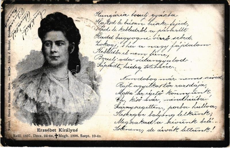 1899 (Vorläufer) Erzsébet királyné (Sissi) gyászlapja 1837-1898 / Obit... https://www.darabanth.com/hu/415-Gyorsarveres/415.0/Kepeslapok/Uralkodo-Politikus~1000082/1899-Vorlaufer-Erzsebet-kiralyne-Sissi-gyaszlapja-1837-1898-Obituary-card-of-Empress-Elis~II2596541