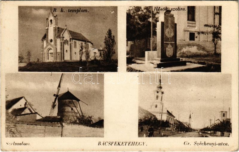 Bácsfeketehegy, Feketic; Római katolikus templom, Hősök szobra, emlékmű, Szélmalom, Gróf Széchenyi utca / Catholic church, military monument, windmill, street view (EK)