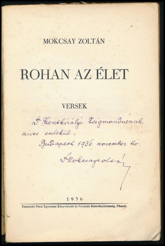 Mocskay Zoltán: Rohan az élet. Versek. DEDIKÁLT! Pécs, 1936., Dunántúl Pécsi Egyetemi Könyvkiadó. Kiadói papírkötés, a borító foltos, a könyvtest részben elvált a borítótól.