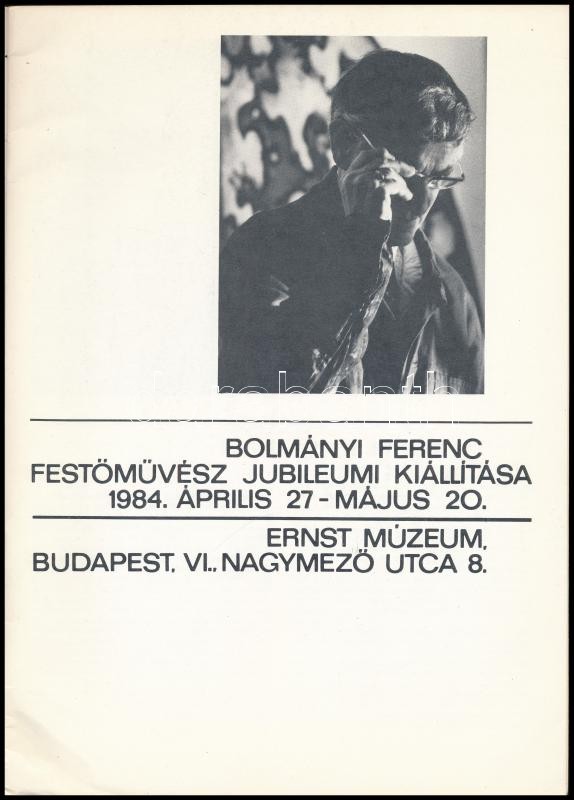 Bolmányi Ferenc festőművész jubileumi kiállítása. Ernst Múzeum, 1984. április 27 - május 20. Bp., 1984, Műcsarnok, 16 p. Fekete-fehér képekkel illusztrált. Kiadói tűzött papírkötés, kissé sérült, kopott borítóval.