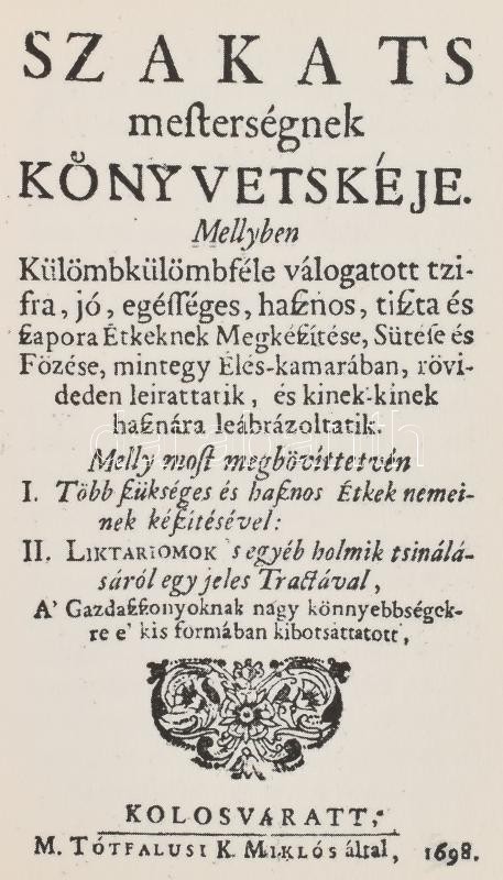 [Misztótfalusi Kis Miklós]: Szakáts mesterségnek könyvetskéje. Értékőrző Könyvtár. [Bp., 2008., Kossuth], 12+170+8 p. A kötet végén Monok István 2 oldalas kis ismertetőjével. Az 1698-as kiadás reprint kiadása. Kiadói műbőr-kötés.