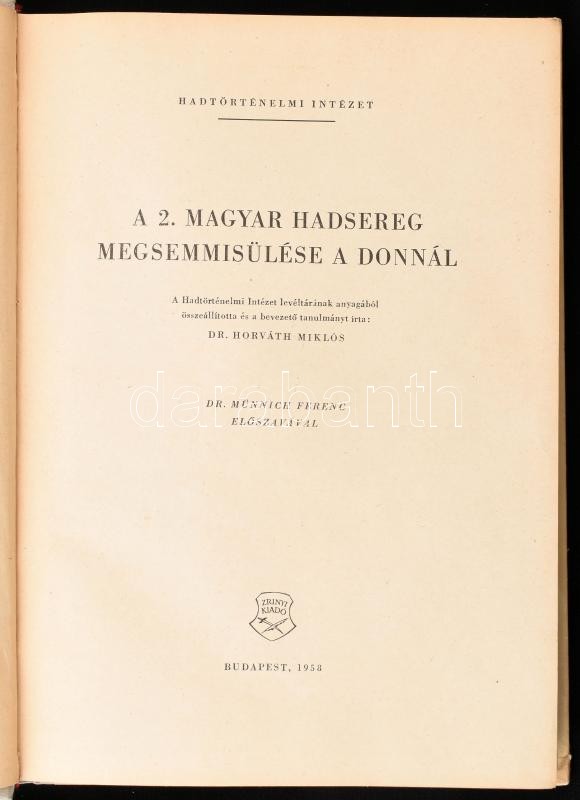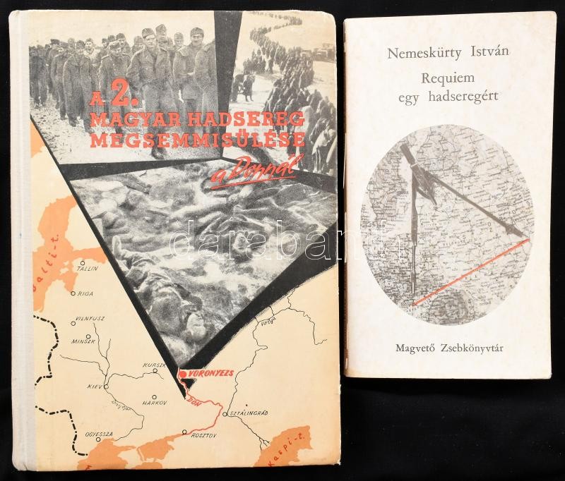 2 db militária témájú könyv: A 2. magyar hadsereg megsemmisülése a Donnál. Összeáll. és a bevezető tanulmányt írta: Dr. Horváth Miklós. Dr. Münnich Ferenc előszavával. Bp., 1958, Zrinyi Kiadó. Első kiadás. Kiadói félvászon-kötés, kissé sérült, kopott borítóval. + Nemeskürty István: Requiem egy hadseregért. Magvető Zsebkönyvtár. Bp., 1972, Magvető. Első kiadás. Kiadói papírkötés, kissé sérült borítóval.