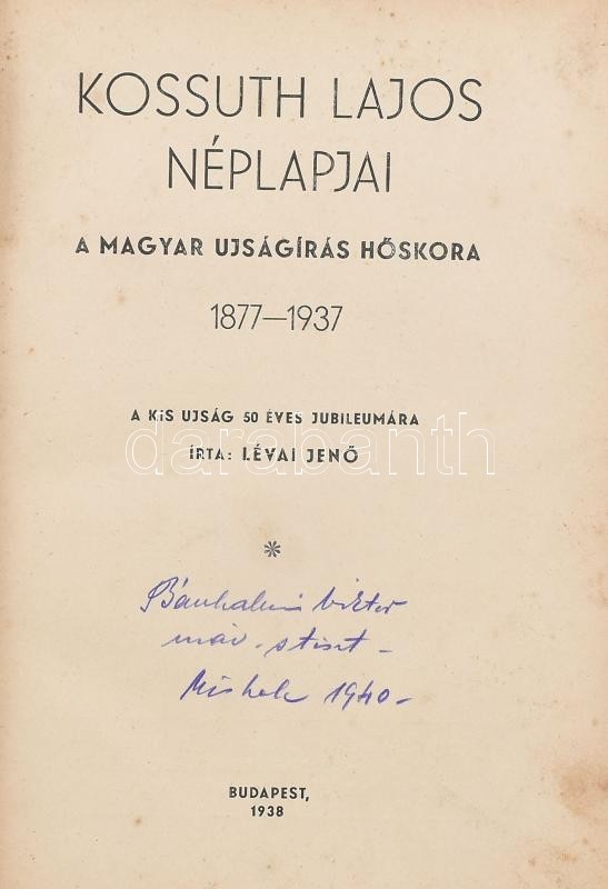 Lévai Jenő: Kossuth Lajos és néplapjai. A magyar újságírás hőskora.1877-1937. Bp., 1938. Kiadói, laza egészvászon kötésben, egy előzéklap kissé sérült.