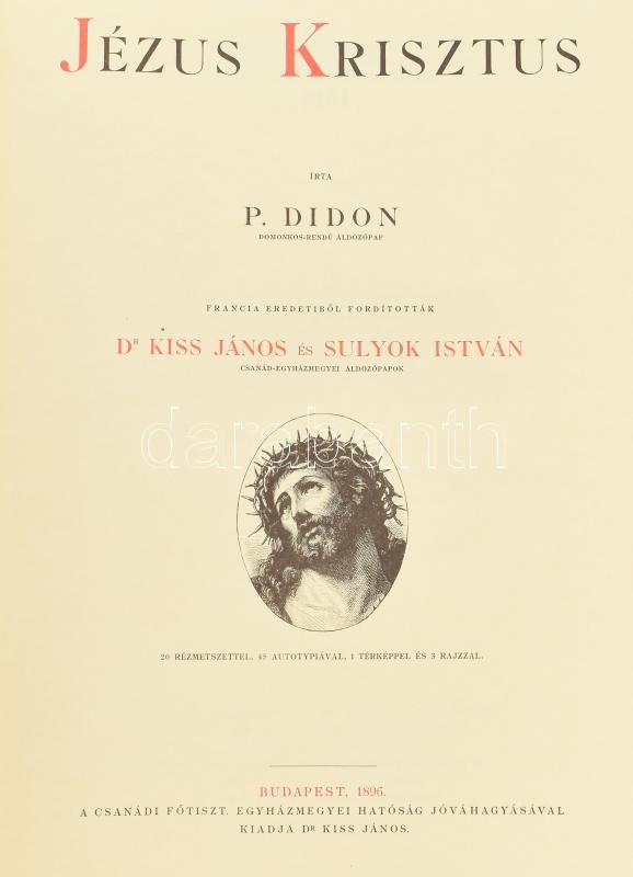 Didon Henry P.: Jézus Krisztus. Ford. Kiss János és Sulyok István. Bp. 1896. Kiss János. Díszkiadás Reprint. aranyozott festett egész-műbőr kötésben, festett egy helyen minimálisan sérült tékában.
