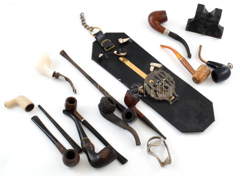 Leírás: 11 db klf pipa: győkér, csont, jó állapotban, három pipatartóval