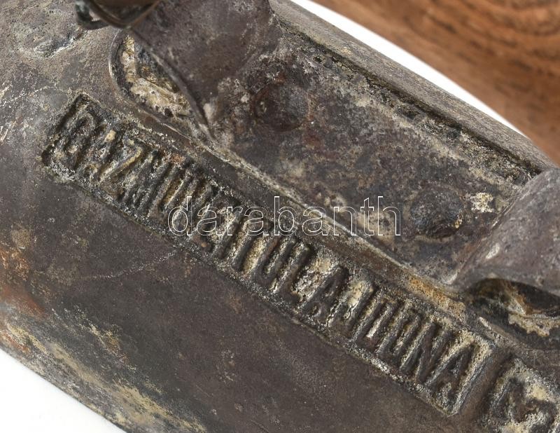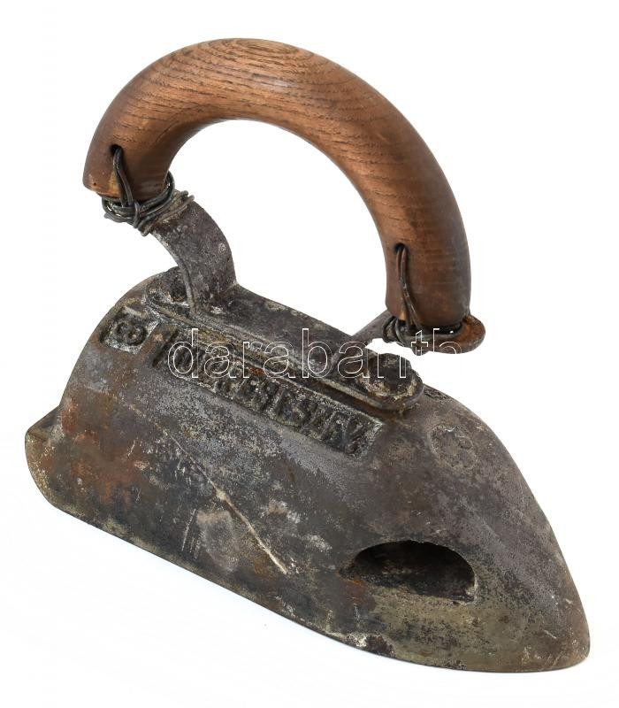Régi vasaló, masszív öntöttvas, fa fogóval, "Budapest Szfv. Gázművei tulajdona" felirattal, XX. sz. első fele. Jelzett, korának megfelelő, kopottas, rozsdafoltos állapotban, a fogó dróttal rögzített, 19,5x8,5x17 cm