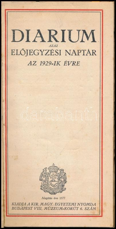 Diarium az előjegyzési naptár az 1929-ik évre. Bp., 1928., Kir. M. Egy... https://www.darabanth.com/hu/415-Gyorsarveres/415.0/Mutargy-papirregiseg-egyeb/Nyomtatvanyok~1500002/Diarium-az-elojegyzesi-naptar-az-1929-ik-evre-Bp-1928-Kir-M-Egyetemi-Nyomda-Papirkote~II2579828