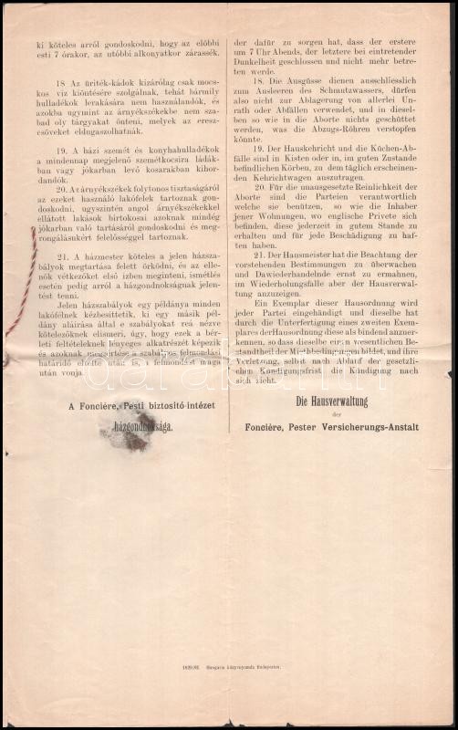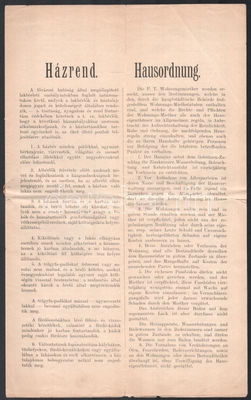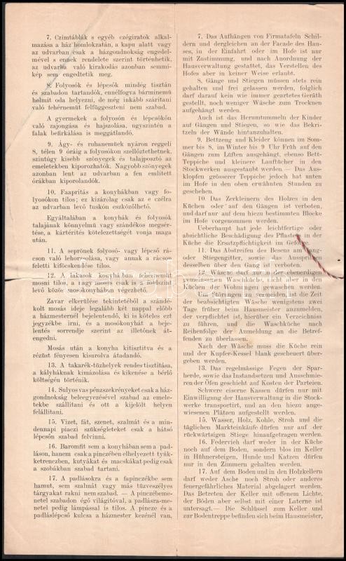 Leírás: cca 1900 Házirend bérház két nyelvű 4 p szakadással