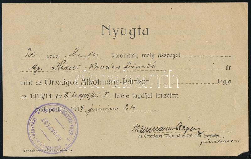 1914 Bp., Országos Alkotmány-Pártkör tagdíjfizetési nyugtája https://www.darabanth.com/hu/415-Gyorsarveres/415.0/Mutargy-papirregiseg-egyeb/Okmanyok~500018/1914-Bp-Orszagos-Alkotmany-Partkor-tagdijfizetesi-nyugtaja~II2605203