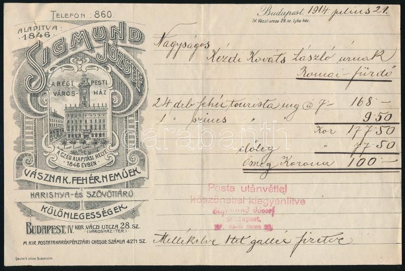 1914 Bp.V., Sigmund József vásznak, fehérneműk üzlete fejléces számla https://www.darabanth.com/hu/415-Gyorsarveres/415.0/Mutargy-papirregiseg-egyeb/Okmanyok~500018/1914-BpV-Sigmund-Jozsef-vasznak-fehernemuk-uzlete-fejleces-szamla~II2605404