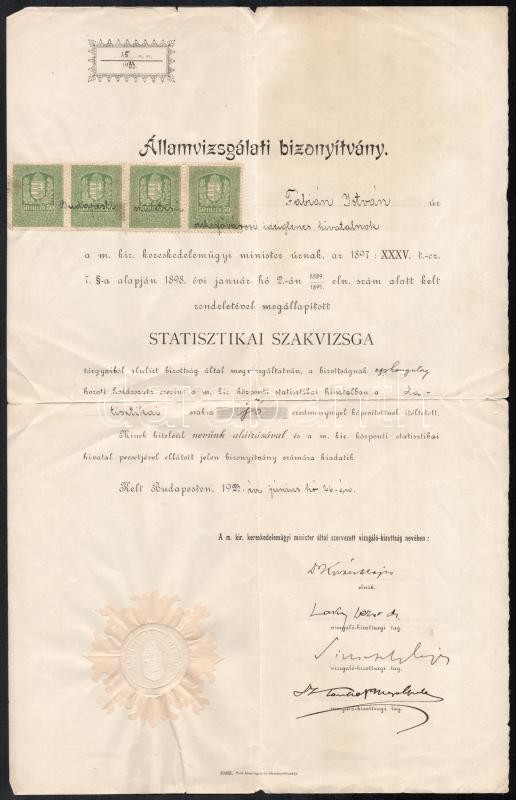 Leírás: 1923 Statisztikai szakvizsga bizonyítvány