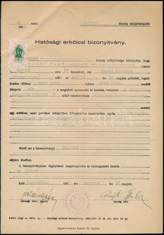 Leírás: 1938 Nagycenk, hatósági erkölcsi bizonyítvány