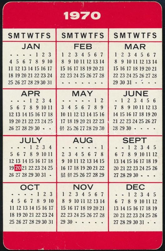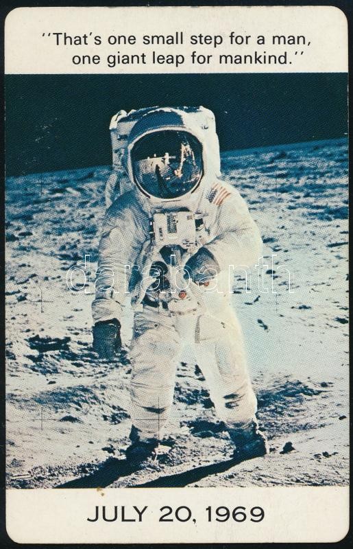 1970 Az első holdra szállás emlékére kiadott kártyanaptár, rajta Neil Armstrong amerikai űrhajós és híres idézete, 9x5,5 cm / 1970 Calendar card commemorating the first Moon landing of Neil Armstrong, 9x5.5 cm