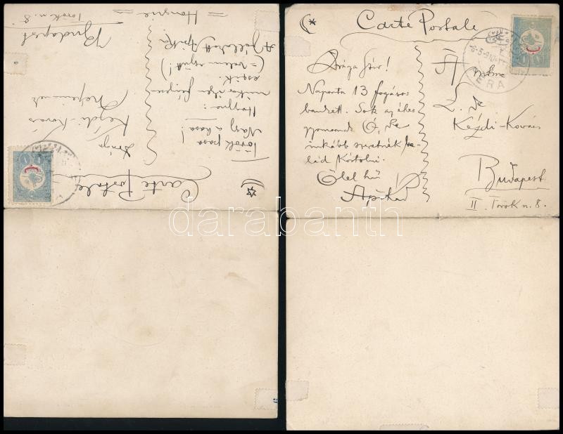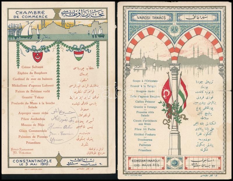 1910 Konstantinápolyi Városi Tanács (Constantinople, Chambre du Commerce) török-magyar díszvacsoráinak menükártyái, 2 db, 1910. május 3. és 22., rajta Kézdi-Kovács László (1864-1942) festőművész autográf soraival a hátoldalán. "Török pasa nagy a hasa! Hogyne: múltkor ilyen fényesen eszik (=velem együtt!) A jóllakott Apika.", hajtottak, 20x13 cm