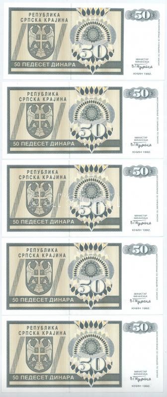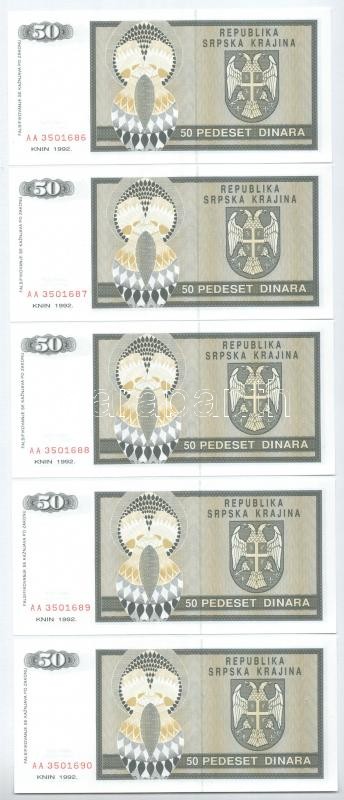 Leírás: Horvátország / Krajna Szerb Köztársaság 1992. 50D (5x) sorszámkövetők "AA 3501686 - 3501690" T:I / Croatia/Republic of Serbian Krajina 1992. 50 Dinara (5x) consecutive serials "AA 3501686 - 3501690" C:UNC
