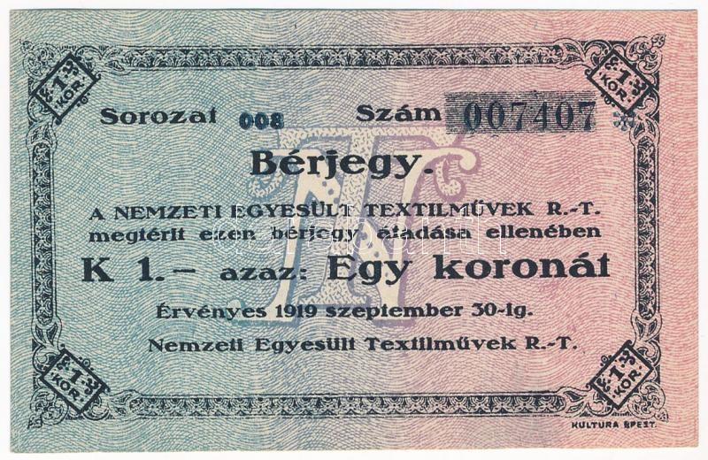 Leírás: Budapest 1919. 1K "Nemzeti Egyesült Textilművek R.T. - Bérjegy" fekete sorozatszám 2mm T:I-