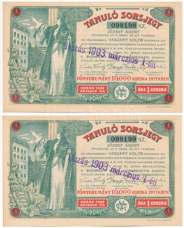 Leírás: Budapest 1903. "Tanuló Sorsjegy" 1K értékben, felülbélyegzéssel (2x, sorszámkövető) T:I-