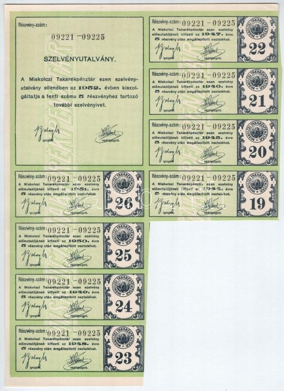 Leírás: Miskolc 1926. "Miskolczi Takarékpénztár" névre szóló öt darab részvénye egyben összesen 100P-ről, szelvényekkel, bélyegzéssel és szárazpecséttel T:II