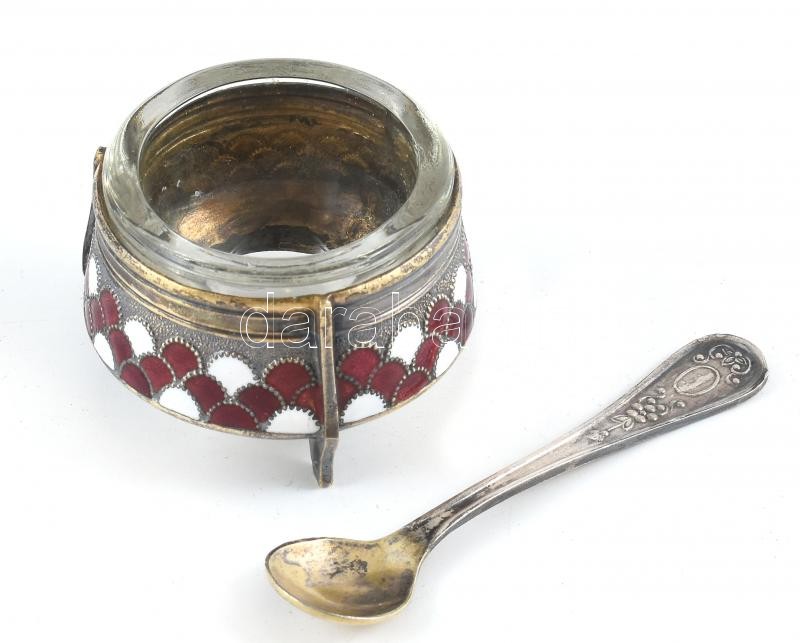 Leírás: Fém kaviártartó zománcozott, üveg betéttel. Kis kanállal. 4 cm