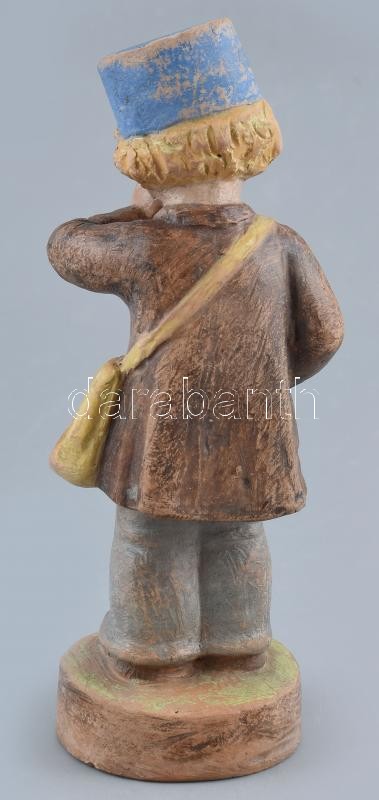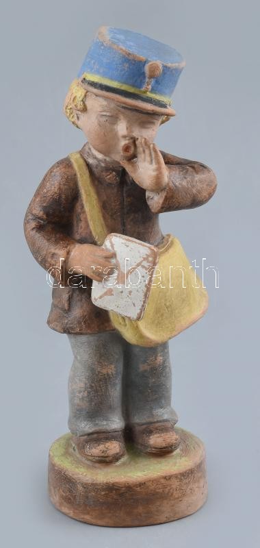 Leírás: Gondos József (1909-1987): Postás fiú. Festett kerámia, erősen kopott, jelzett, m:20 cm