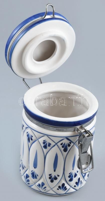 Leírás: Kék virágmintás kerámia csatos edény, jelzés nélkül, kézzel festett, kis kopásnyomokkal, m: 14 cm