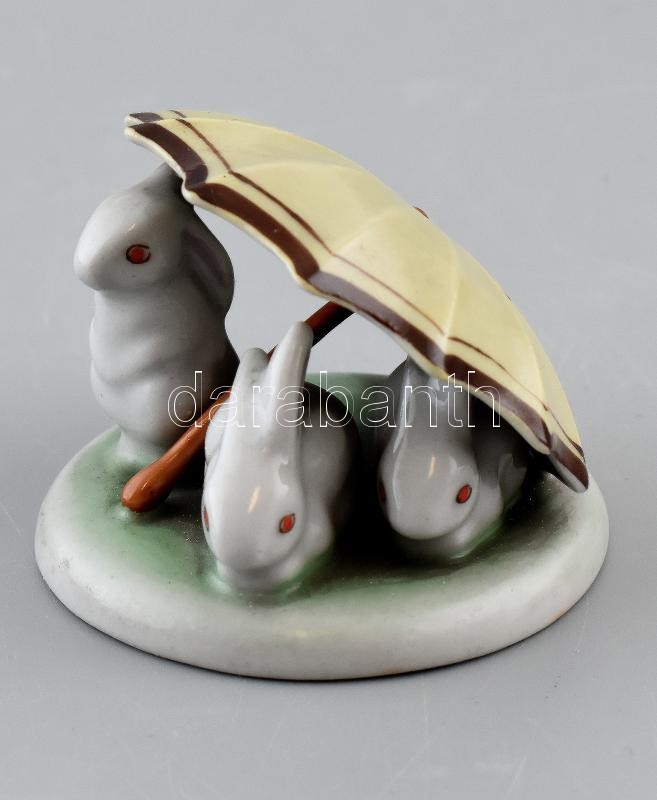 Leírás: Kőbánya / Drasche porcelán nyuszik ernyő alatt, kézzel festett, jelzett, hibátlan, 5×5,5 cm