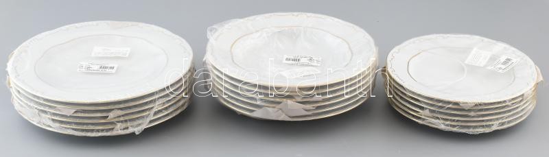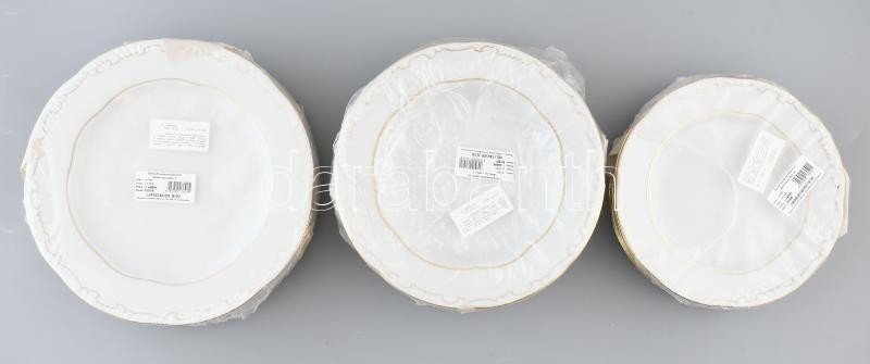Leírás: Zsolnay tollazott süteményes tányér, leveses tányér, lapostányér (6-6-6db), jelzett, original dobozban.