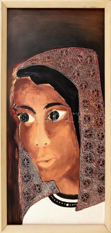 Leírás: Jelzés nélkül: Arab női fej. Olaj, applikáció, farost. Kissé sérült fakeretben, 69×32,5 cm
