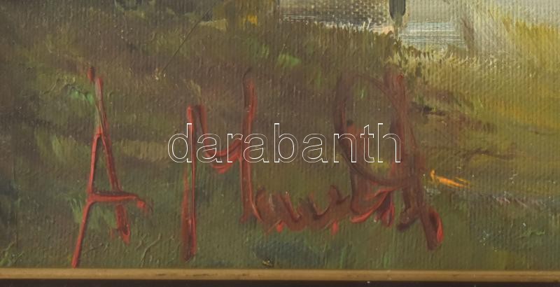 Leírás: Olvashatatlan jelzéssel: Táj. Olaj, vászon. 33x44 cm. Dekoratív, üvegezett fakeretben.