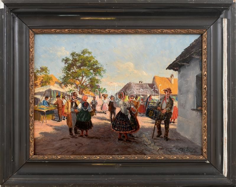 Leírás: Olvashatatlan jelzéssel: Vásár. Olaj, karton, jelzett. 26x34,5 cm. Dekoratív, sérült fakeretben.