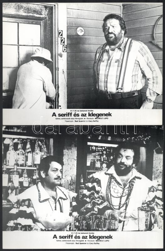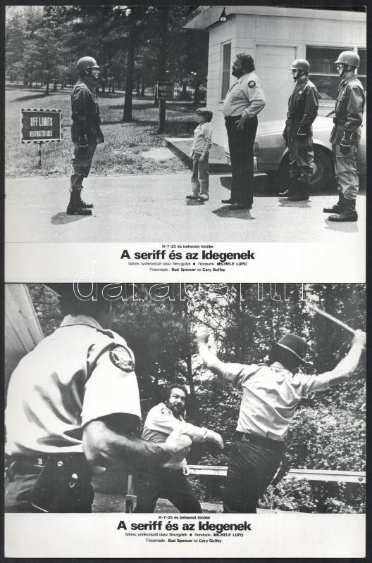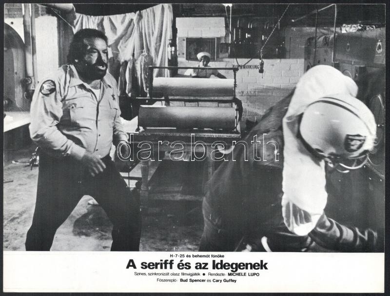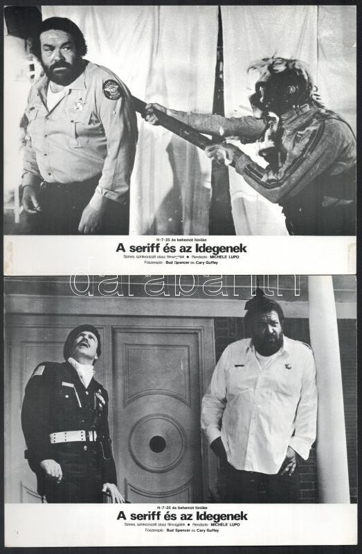 1980 ,,A seriff és az idegenek - a H-7-25 és behemót főnöke" című olasz filmvígjáték jelenetei és szereplői (köztük Bud Spencer és Cary Guffey), 7 db produkciós filmfotó, ofszet nyomdai eljárással, egy oldalas nyomtatással, kartonlapra készített képek, 18x24 cm