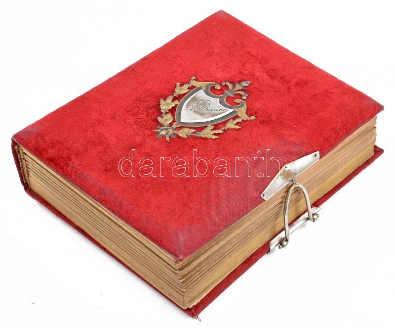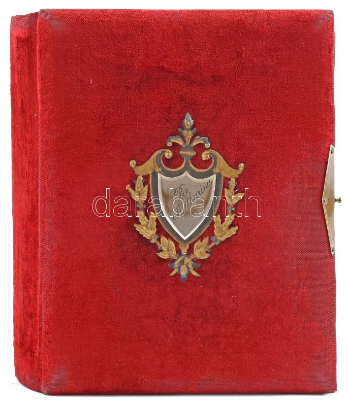 cca 1870-1910 Német/erdélyi származású, pesti zsidó kereskedőcsalád és rokonságuk családi fotóalbuma. Összesen 80 db keményhátú fotó (kabinetfotó, vizitkártya), 40 különböző műteremből (közte ritkán előfordulóak, pl. Büki Fejér Róza, Barabás Miklós, Schrecker Ignác, Szentkuty István, Schöfft Béla, Simonyi Antal). A képeken többek közt Tolvaj Aladár, a győri nyugdíjintézet elnöke, Diviaczky János kölcsönszövetkezeti igazgató, Dr. Huszka János miniszteri tanácsos. Dekoratív, bársonyborítású, fémveretes, kapcsos albumban, helyenként kissé sérült albumlapokkal.