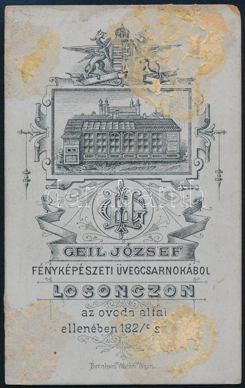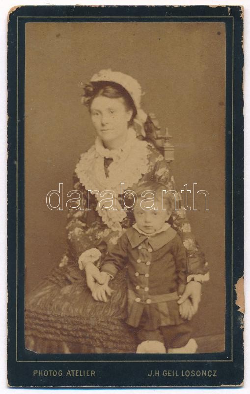 Leírás: cca 1880 Nő gyermekével, keményhátú fotó Geil József losonci műterméből, kissé sérült karton, hátoldalon a műterem képével, 10,5×6,5 cm