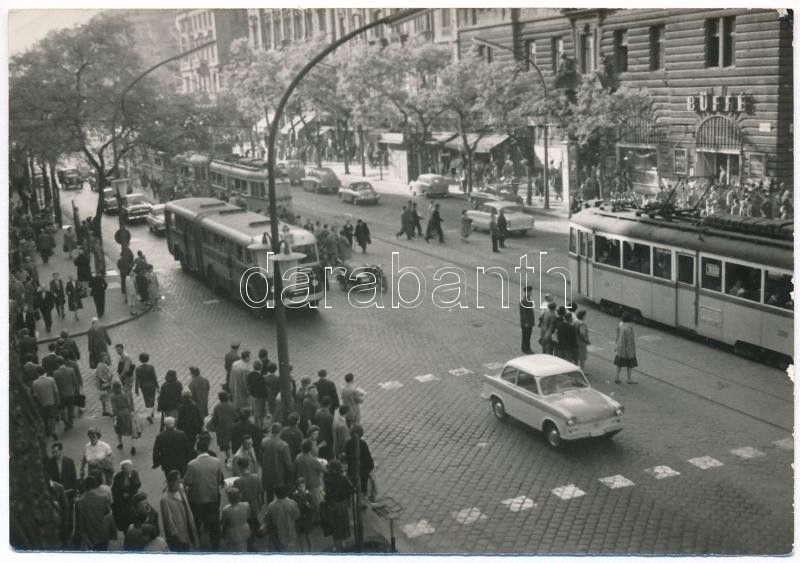 cca 1960 Budapest, erős forgalom a Nagykörúton, busz, villamos, rendőrmotor középen leállítva, fotó minimális kopásokkal a szélén, de jó állapotban, 9×13 cm